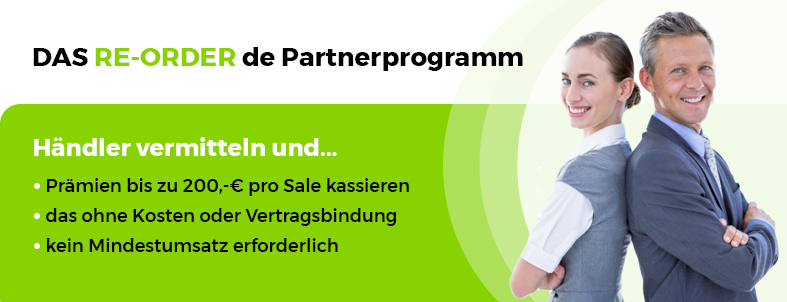Gewinnen Sie Neukunden für RE-ORDER.de und profitieren Sie von unserem cleveren und attraktiven Prämiensystem. Durch eine Vielzahl von kostenlosen Werbemitteln steigern Sie Ihren Vermarktungserfolg und kassieren attraktive Prämien. Informieren Sie sich auf den folgenden Seiten und werden Sie noch heute Partner.